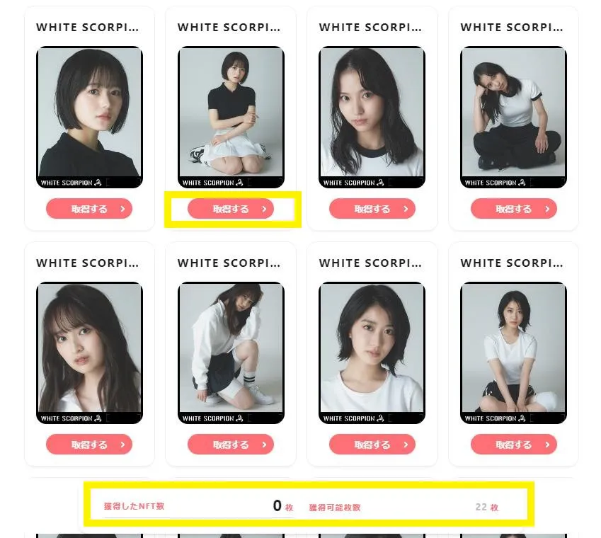 クーポンコードを入力し、受け取るための条件が整っているNFTに関しては③のページで「取得する」がピンク色で表示され受け取りすることができるようになっています。「取得する」が薄く表示されている場合は、条件を満たしておらず受け取ることができません。また、受け取り済みのNFTに関しても「取得済み」と薄く表示され、再度受け取ることはできないようになっています。