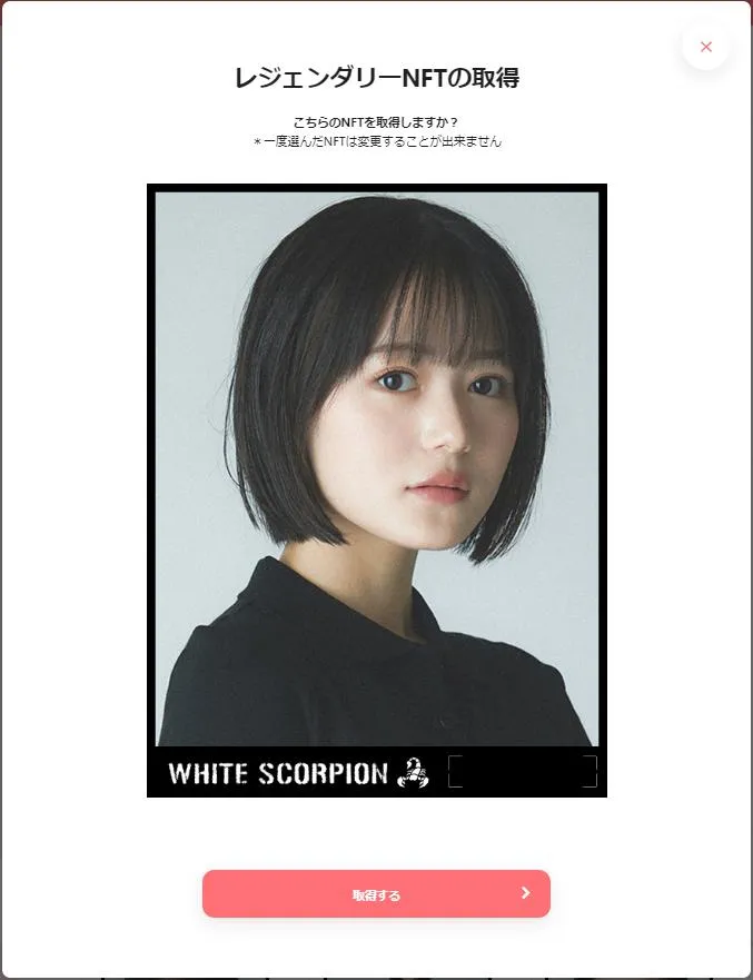 ④からご希望のNFTを選択すると、NFTを受け取るための確認画面が表示されます。ここで「取得する」を選択すると、処理が開始されます。画面を閉じずにそのままお待ちください。