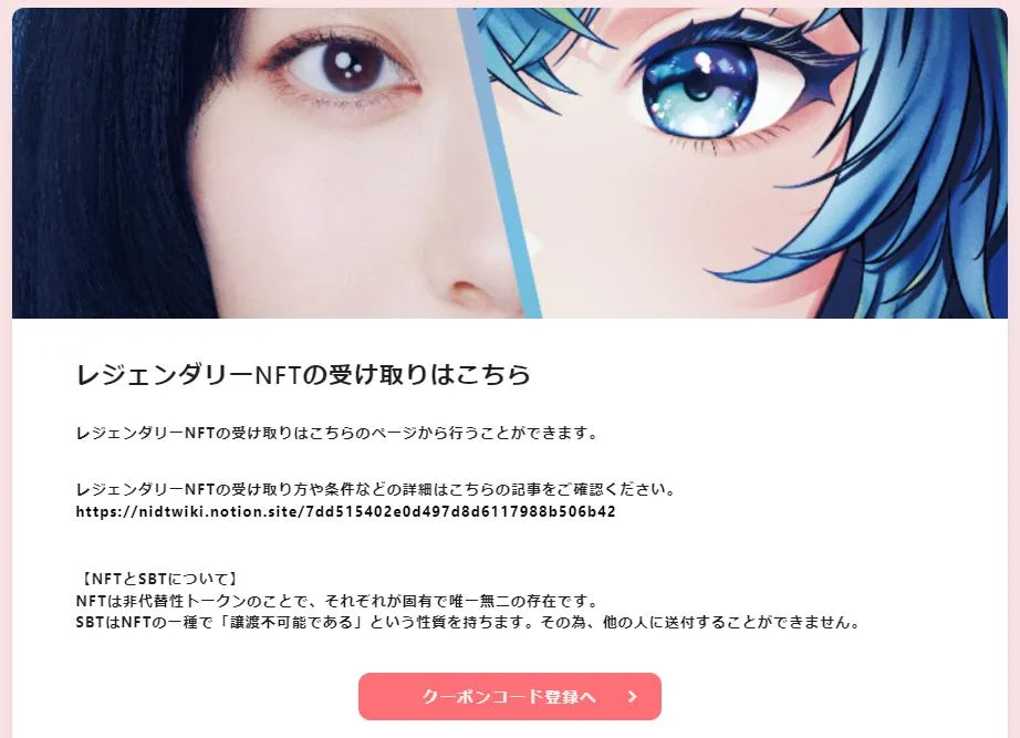 NIDT ポータルの「NIDT保有数量登録」より、クーポンコードを入力していただくことで、レジェンダリーNFTを受け取ることができるようになります。