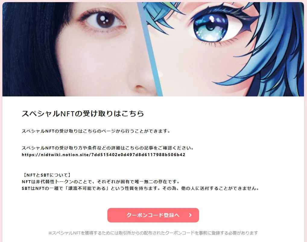 NIDT ポータルの「NIDT保有数量登録」より、クーポンコードを入力していただくことで、スペシャルNFTを受け取ることができるようになります。