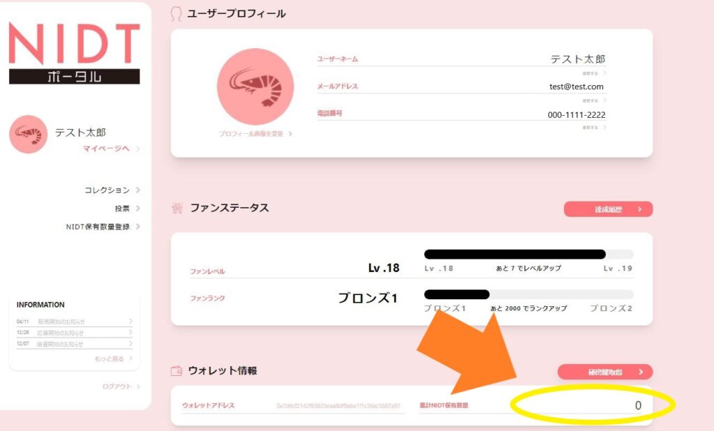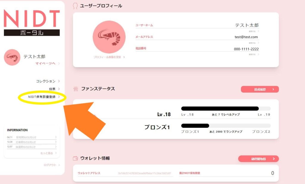 NIDT保有数量登録からクーポンコードを登録することによって、累計NIDT保有数量がマイページに表示されるようになります。
