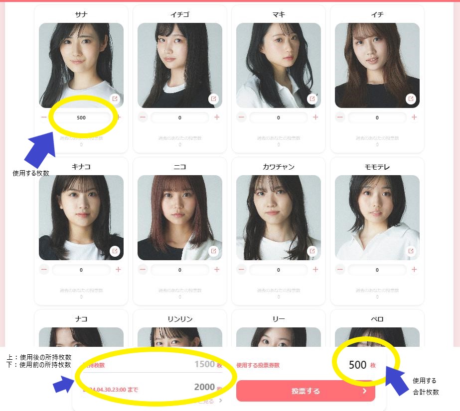 投票したい選択肢の下の「-」と「+」を操作するか、数字を直接入力し、投票枚数を選択してください。同時に複数の選択肢に投票をすることもできます。